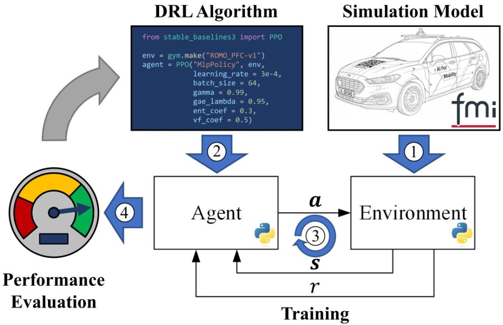 The train_fmu_gym toolchain represents a significant advancement in applying reinforcement learning to multi-physical systems by bridging existing simulation models with modern Deep Reinforcement Learning (DRL) frameworks. This framework, as shown below, enables researchers and engineers to leverage existing simulation models by using the Functional Mock-up Interface (FMI) standard (1) to create gymnasium-compatible training environments (3) including their DRL algorithms (2) with a comprehensive performance evaluation (4).